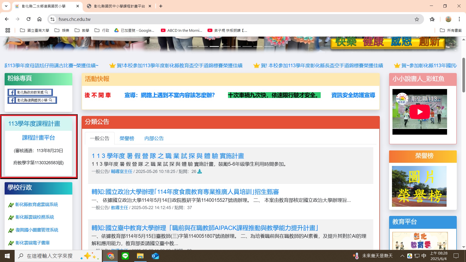 10-2 學校首頁放置連結「彰化縣國民中小學課程計畫平台」網站之截圖